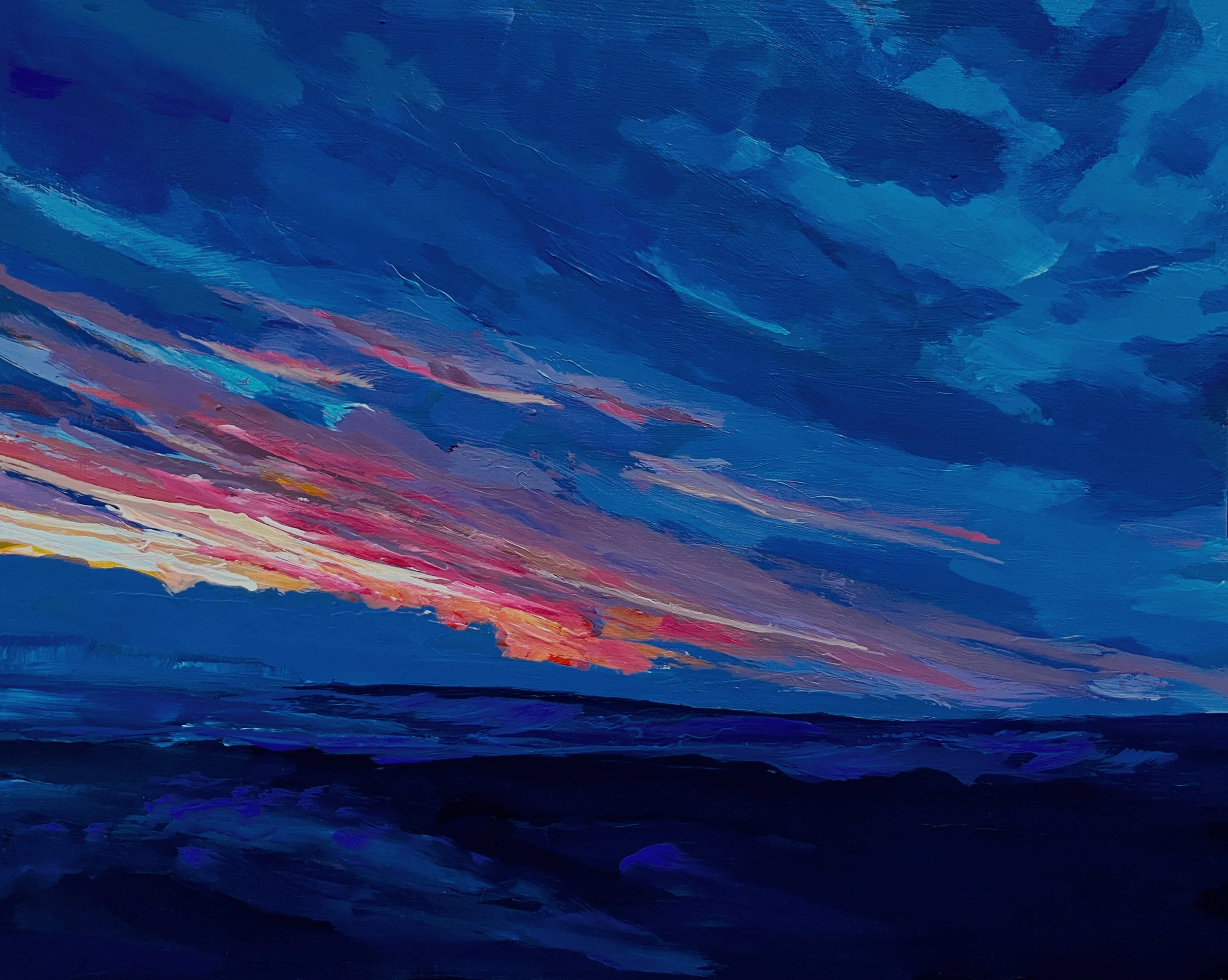 He works primarily in acrylic, oil, watercolour and fine-line ink, producing expressive, atmospheric pieces that explore the shifting moods of weather, light, and season. His practice often begins with walking and photographing remote locations—capturing the exact moment when light breaks through cloud or mist rolls in across the hills. These fleeting, cinematic qualities are central to his style, which balances bold mark-making with delicate detail.